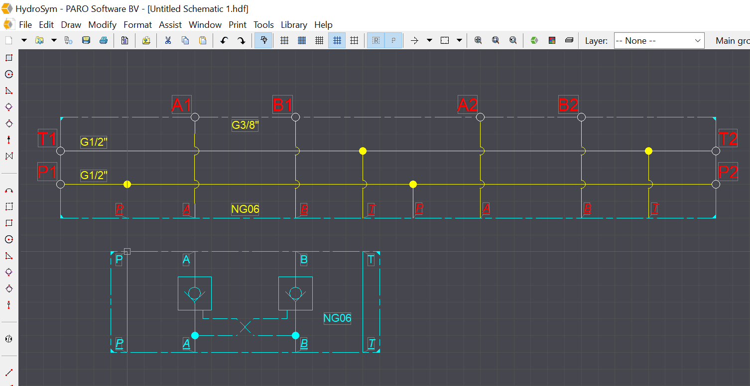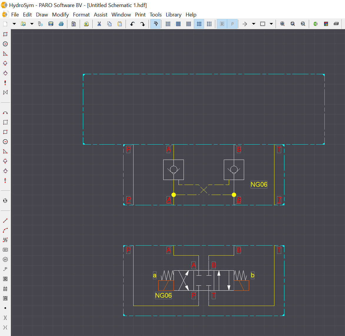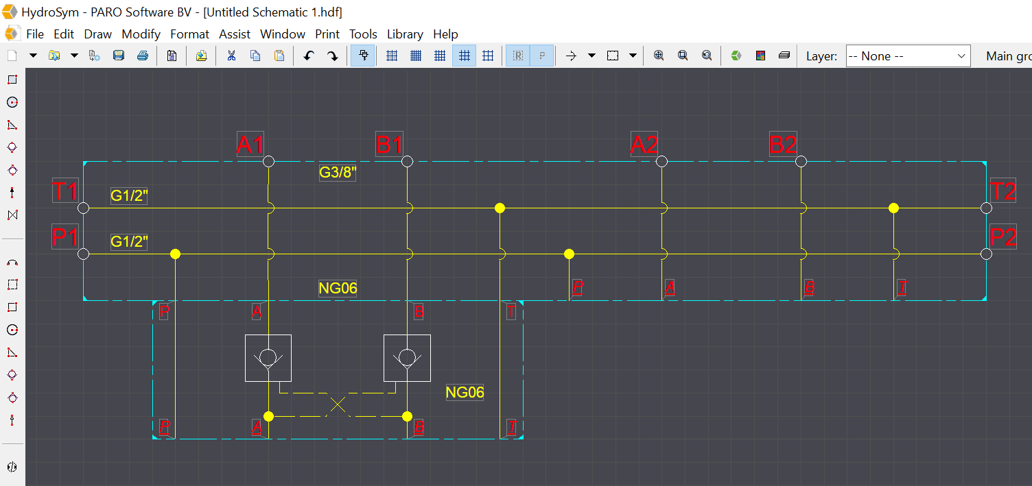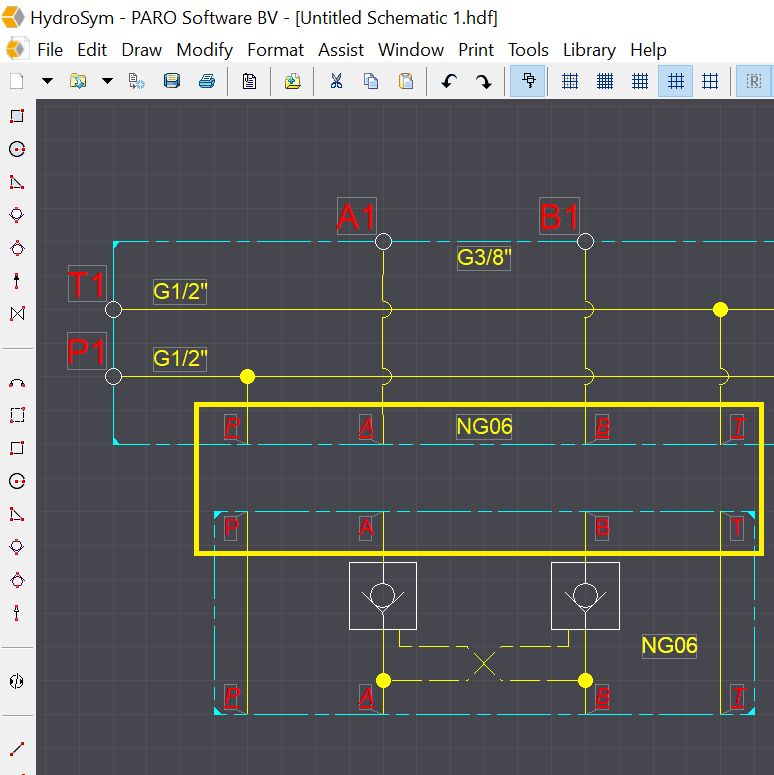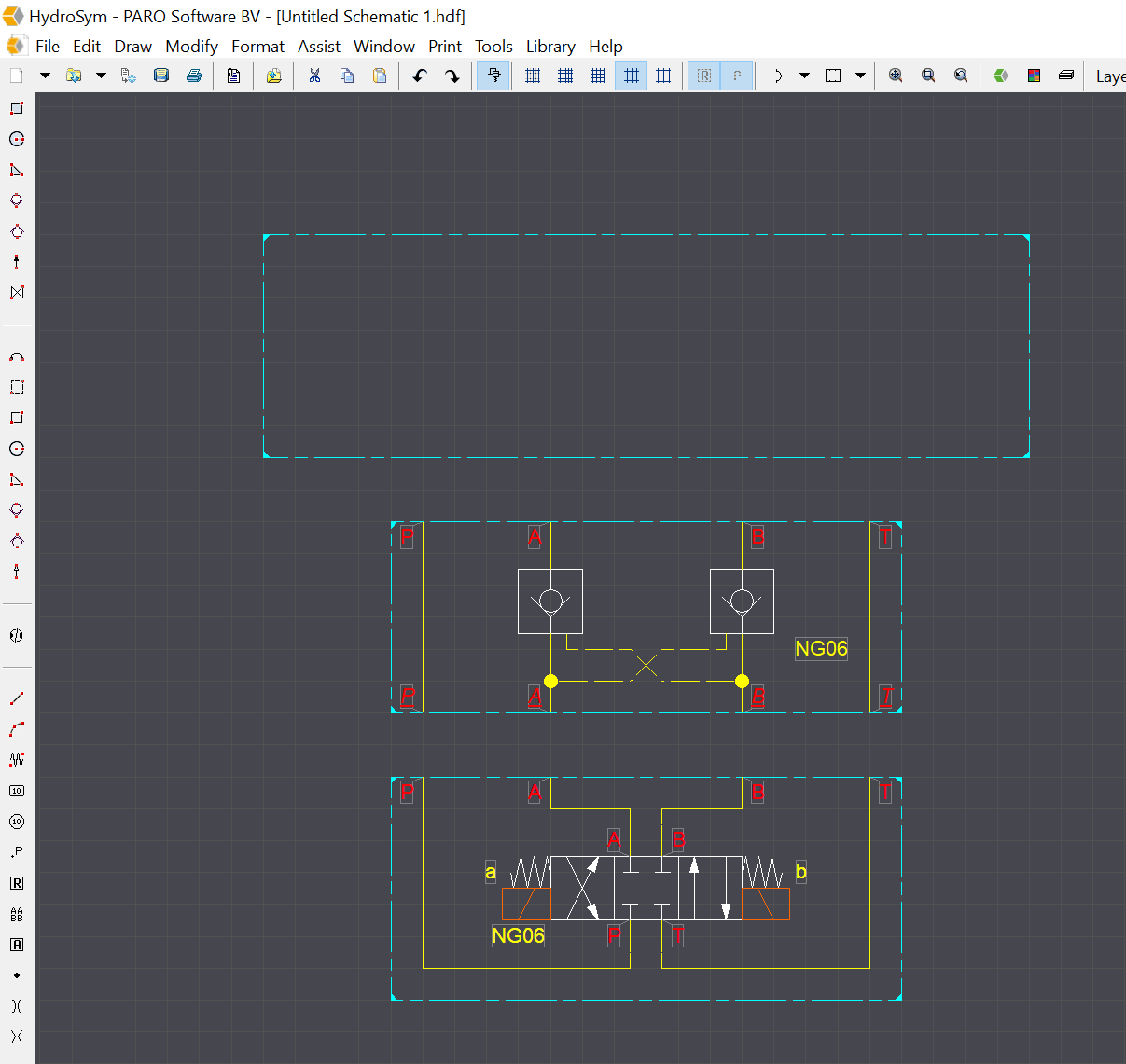 To build a modular stack first insert a sandwich valve. In this case we used a Z2S06-3X from Bosch Rexroth. You can find this in the library.