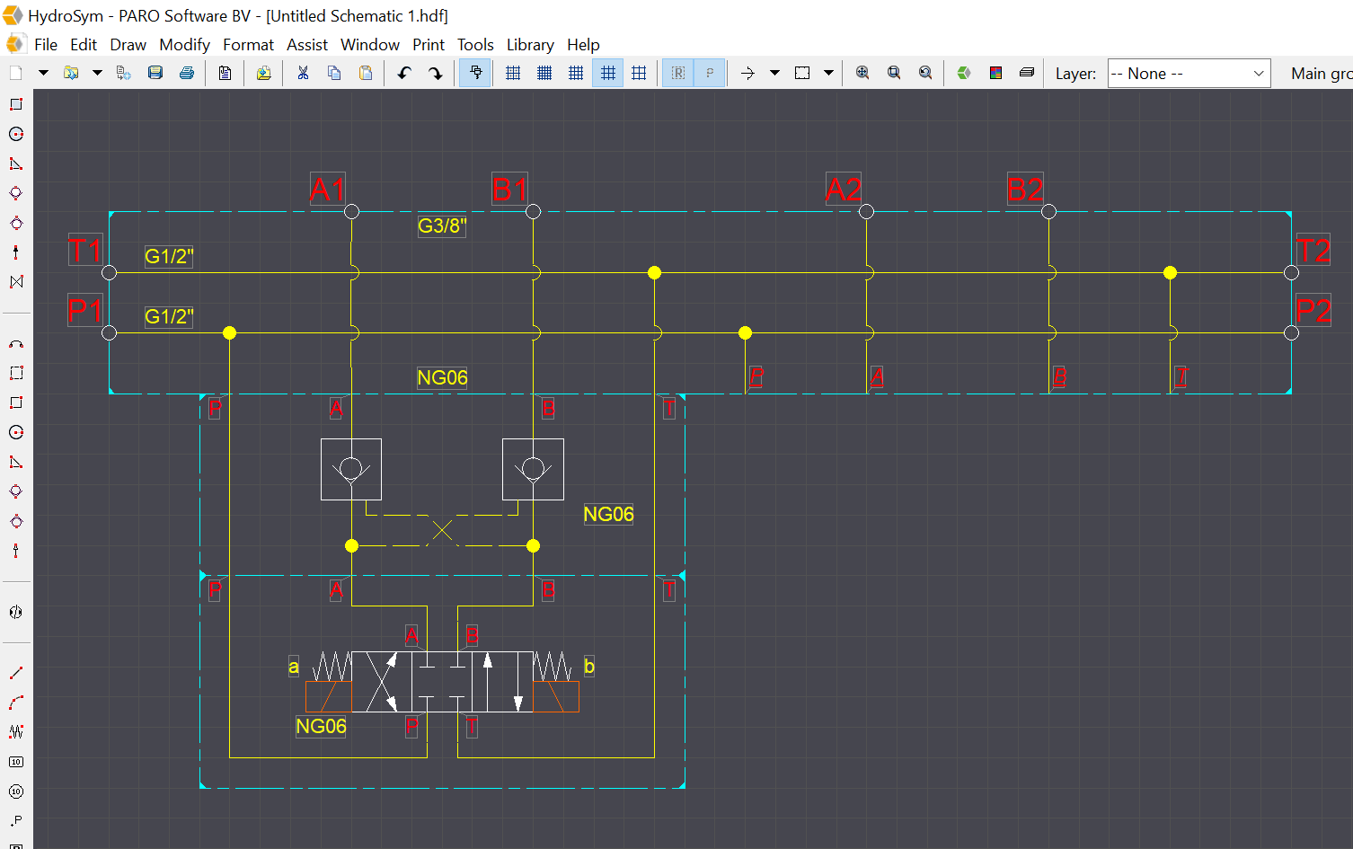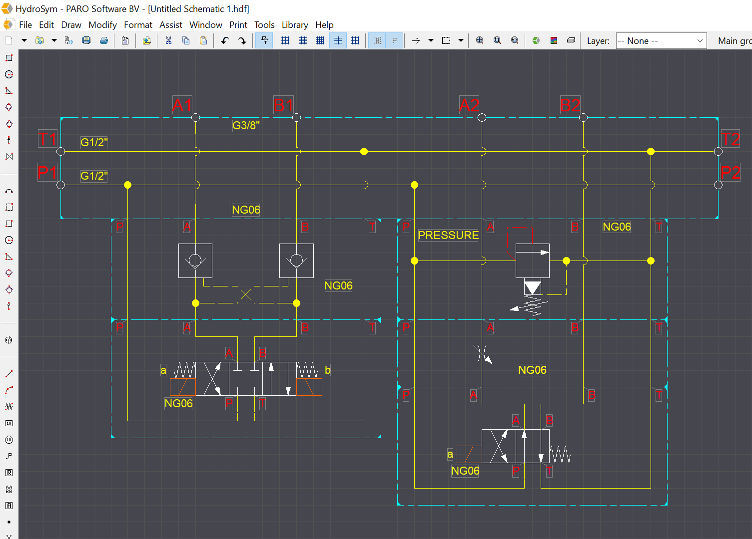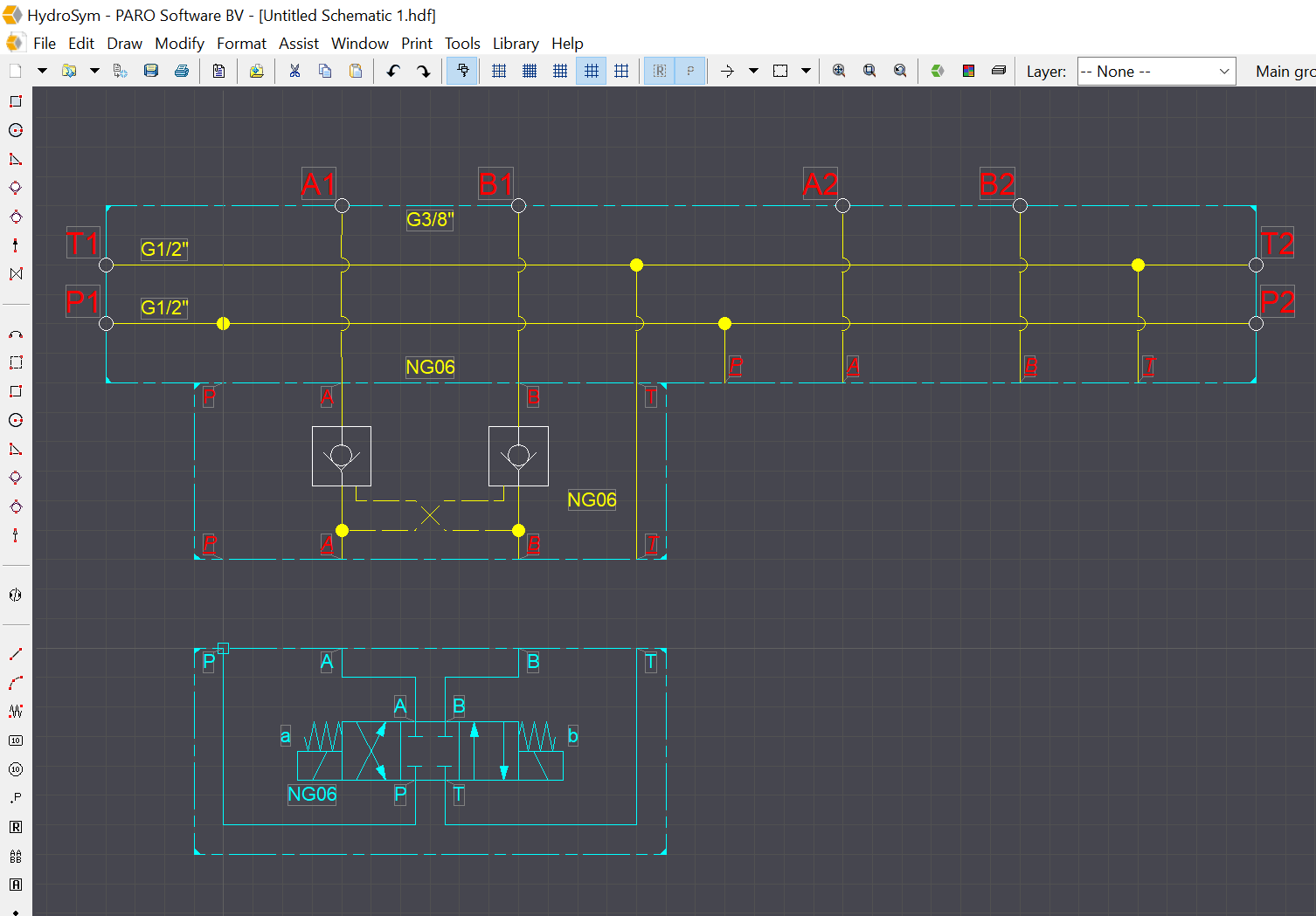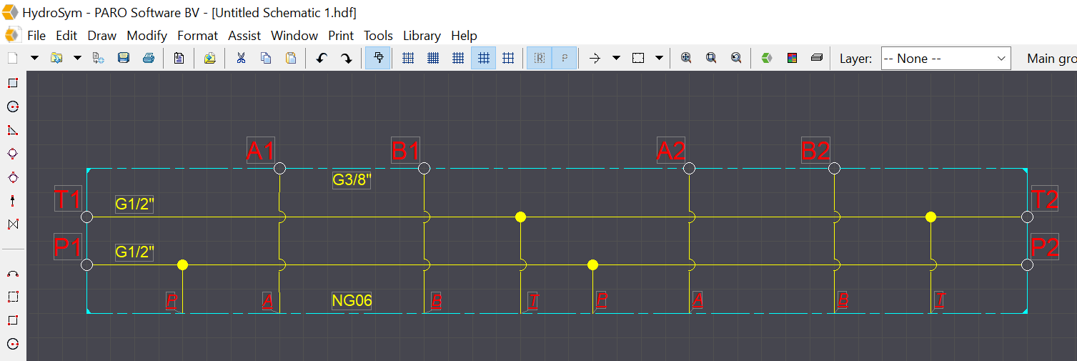 To build a modular stack first insert a sandwich valve. In this case we used a Z2S06-3X from Bosch Rexroth. You can find this in the library.