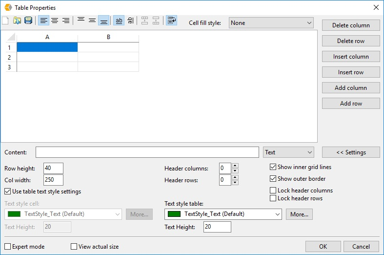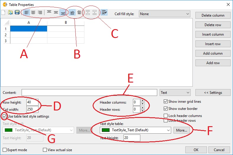 - G: when the option “Use table text style settings” is not selected, with this option the style of the selected cell(s) can be changed. When it is desired to move a certain row or column this can be done so by dragging the row or column to the desired location.