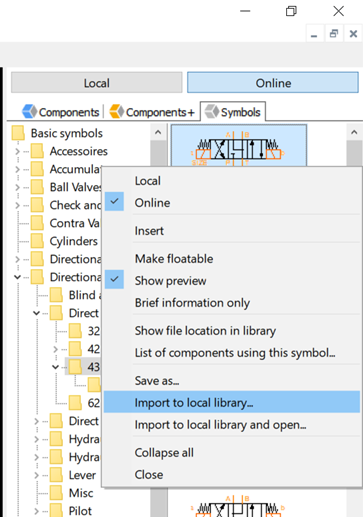 - There are multiple ways to build your own library. The easiest way is to go to the online library and search a similar symbol. In this example a 4 / 3 directional valve. Select the symbol and then use the right mouse click.
